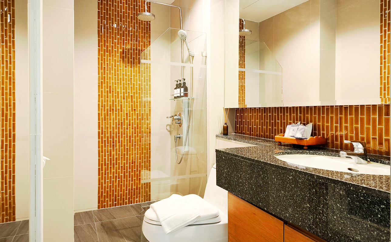 The One Bedroom Sea View Suites are located on all floors and feature 1 bedroom with King-sized bed, 1 large living room with private bar counter and refrigerator, 1 bathroom with a Rain Shower head and toilet, 1 secondary toilet and 1 large balcony with views of the Gulf of Thailand.